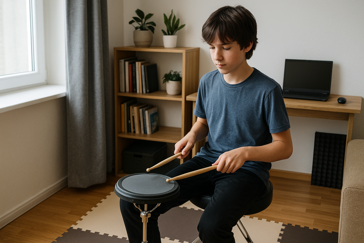 マンションでは音が壁や床を通じて想像以上に広がることがあります。消音パッドを使っていても、打撃音や振動が残るため対策が必要です。厚手のカーペットやジョイントマットを敷くことで床に伝わる音を減らし、壁際から離れた位置で練習すると響きにくくなります。加えて、カーテンや布類を多めに配置すると反射音が減り、体感的にも静かに感じられる環境をつくることができます。