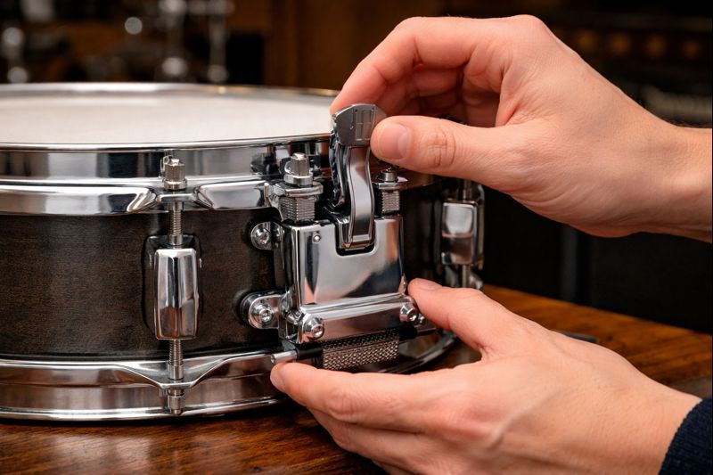ストレイナーは、スネアドラムの胴体側面に取り付けられています。多くの場合、利き手とは反対側にレバーが配置されており、演奏中でも素早く操作できるよう設計されています。外から見えるのはレバー部分ですが、内部ではスナッピーと連動する機構が組み込まれています。この位置関係を把握しておくことで、構造の理解が一気に進みます。